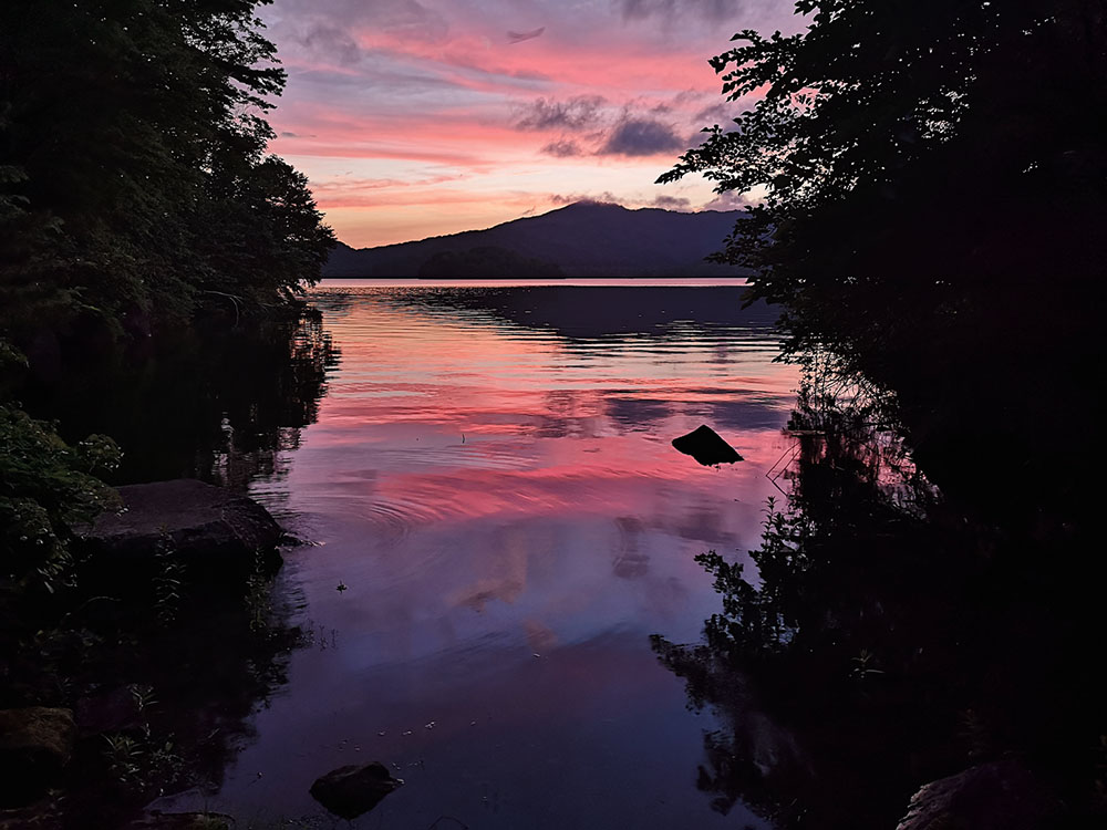 サイト前の猪苗代湖はまるでプライベートビーチのよう。サイト間は木々や岩で仕切られています。