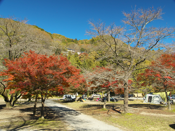 キャンプサイトは清流・道志川沿いに広がり、野趣あふれる雰囲気が魅力。