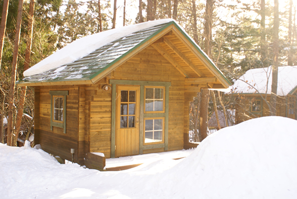 木のぬくもりが心地いい、フィンランドウッドを使用したバンガロー。布団とストーブ付きなので、初めての冬キャンプにもおすすめ。