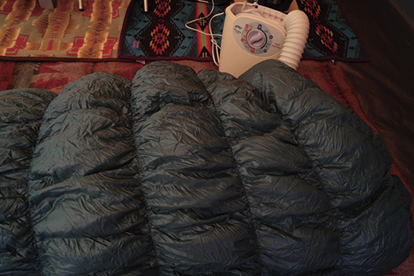 冷たい寝袋やブーツに足を入れると身体の芯まで冷えるが、数分だけ温風を送り込んでおけば冷えずにすむ。