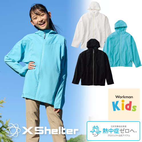 エックスシェルター 暑熱フーディの子ども向けサイズ。暑熱リスク対応機能は大人向け製品と変わらないが、360度プロテクトフードは付かない。子どもは大人に比べて周辺視野が狭いので、付けない方が安全だろう。