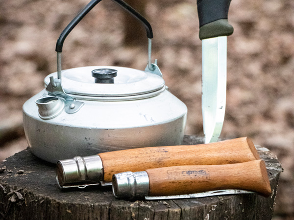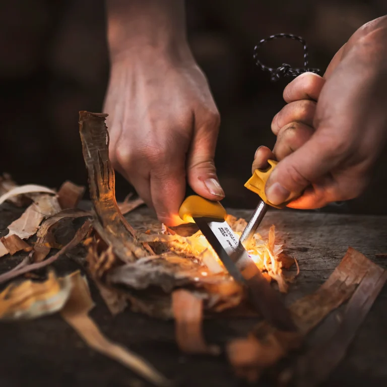 着火には、火起こしの道具選びからこだわりたい。たとえば「モーラ・ナイフ コンパニオン スパーク」なら、刃元にファイヤースターターが内蔵されており、フェザースティックを削ったあと、そのまま火花を飛ばして着火できる。ナイフとしても使いやすく、一本持っておくと非常に心強い。