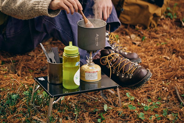 SOTO「フィールドホッパー」は、A4ハーフサイズに折りたたみ可能な超軽量テーブルで、展開もワンタッチ。バックパックキャンプにも対応できる省スペース設計だ。