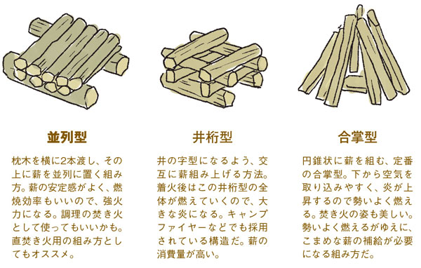 薪の組み方でも違いは出る。合掌型にすれば炎が高く立ち上がりやすく、並列型は安定感があって燃焼効率もいい。他にも細かいバリエーションもある。組み方によって火の回り方が変わるので、試してみると違いがはっきり出る。