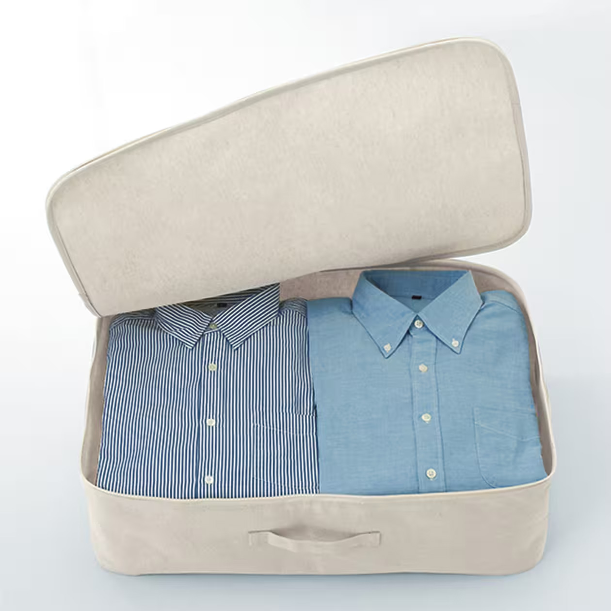 無印良品の「ソフトボックス 衣装ケース」や、アイリスオーヤマのキャスター付きケースは、低い隙間にも入りやすく、出し入れもスムーズ。