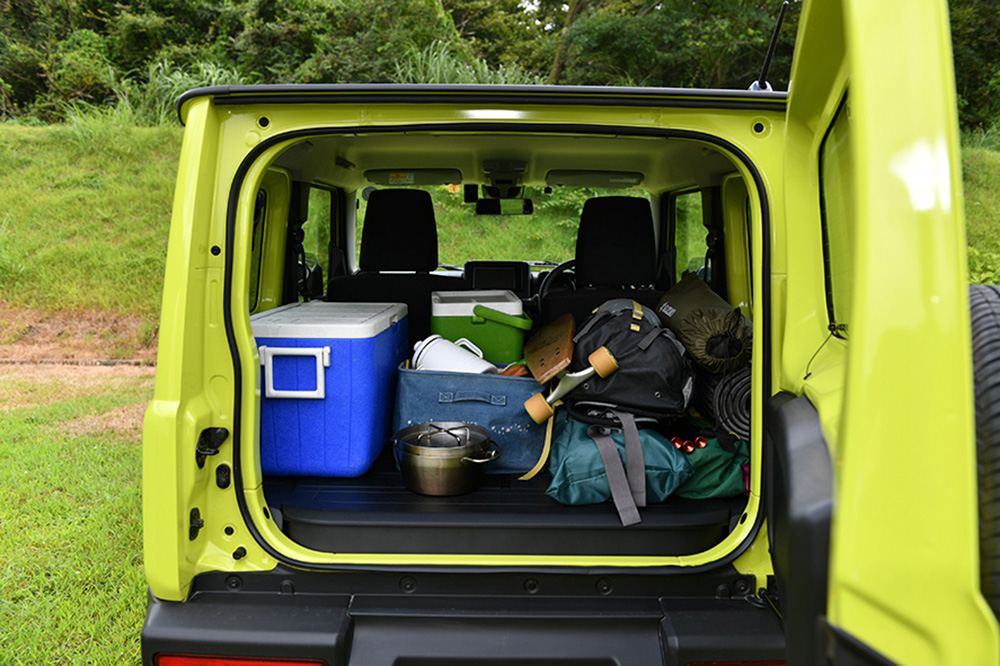 キャンプ場に到着して最初に使う「設営セット」は、荷室の手前やスライドドア側に置くことで、他の荷物を動かさずにスムーズに取り出せる。