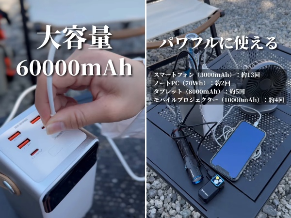 本製品であれば、スマートフォンなら約13回、ノートPCなら約2回程度の充電が可能だ。キャンプのみならず防災用としても活躍すること間違いなしだ。