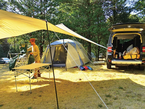 オートキャンプの魅力は、車を活用することで楽しみ方の幅がぐっと広がるところにある。たとえばファミリーなら、大きめのテントやタープを張って、アウトドアリビングのような空間をつくるのもおすすめだ。