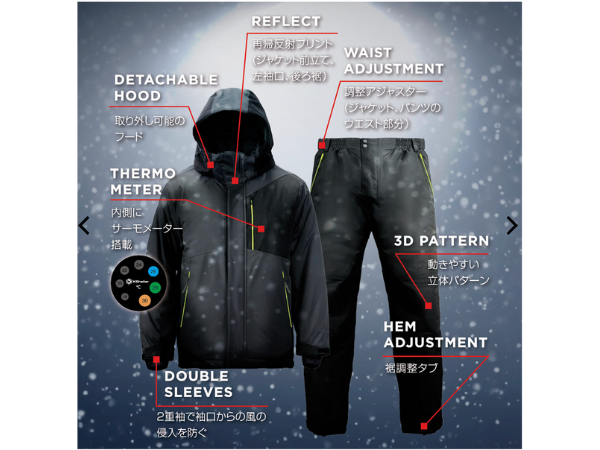 「エックスシェルター®断熱αイージスプレミアム防水防寒スーツ」(9,800円)は、ジャケットとパンツがセットになったハイランクモデル!