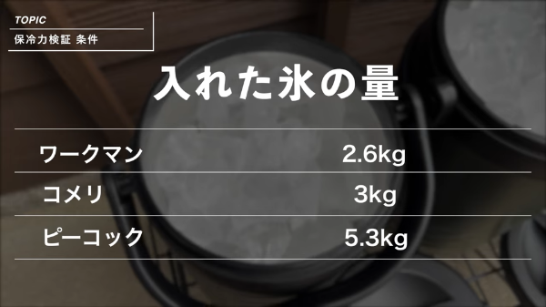 本題の保冷力検証は、屋外日陰・最高34℃の条件で各コンテナを氷のみで満たし、24時間後の残存率を計測した。投入量はワークマン2.6kg、コメリ3.0kg、ピーコック5.3kg。