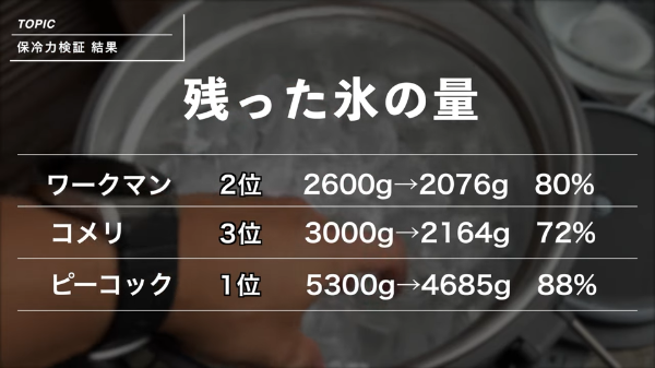 結果はワークマン約80%、コメリ約72%、ピーコック約88%の氷が残る結果となった。あきとぶさんいわく、ピーコックは側面の肉厚と蓋のポリウレタン断熱+高密閉が効いて明確に頭抜けたのではと解析した。