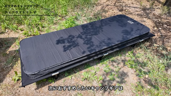 最後に紹介したのは、自動膨張式の極厚マット。内部のウレタンはやわらかめで、空気を足して好みの硬さに調整できる。地面の凹凸や底付きの不安がなくなり、横向き寝でも肩や腰をしっかり受け止める。また裏面は起毛生地で滑りにくく、コット上でも安定。サイドの連結ボタンを使い同じマットをつなげれば、ダブルベッドにも変身。