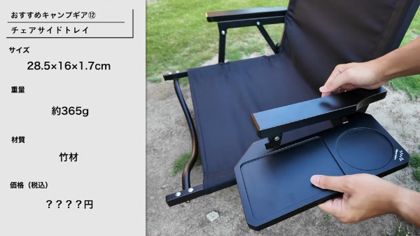 撥水ローチェアにさっと引っ掛けて固定するだけの専用トレー。スマホやマグカップ手元の置き場が一気に整う。ローチェアとセットで導入すると満足度が跳ね上がる一品だ。