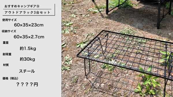 キャンプ用ラックの定番で、スチール製で耐荷重はおおむね30kg。脚を広げるだけの瞬間設営で、スタック運用も自在。アルペンの肝は3台+収納バッグで5,990円(税込)という点だ。クーラーボックスやコンテナの定位置づくり、焚き火回りの置き場としても大活躍するこのアイテム。キャンパーはもれなくチェックすべき製品だ。
