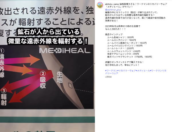 メディヒールは5年前からワークマンで展開しているシリーズだが、昨今のリカバリーウェア人気の高まりを受けて、ワークマンは2025年秋冬に「メディヒール」の展開に力を入れていくとのこと。