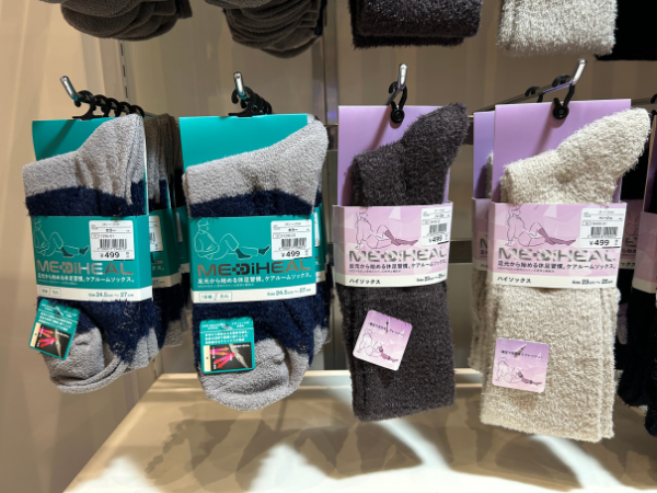 前項のメディヒール休足ケアルームソックスのレディース版の、「レディースメディヒール®休足ケアルームソックス」(499円)。ふかふかの肌触りとほどよい着圧で、足元からリラックスできるアイテムです。
