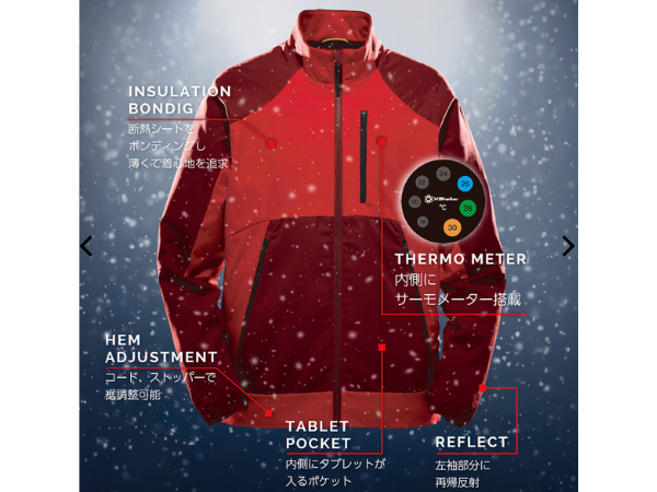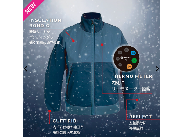 - 特徴:断熱・吸光発熱・保温・軽量・耐久撥水・2wayストレッチ・反射材・中綿入り