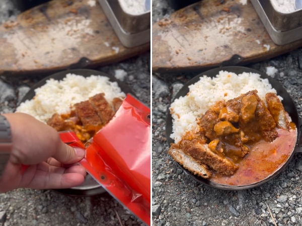 食材はレトルトカレー、パック飯、調理済みのカツ。本体でレトルトカレーを湯煎しながら、中蓋でご飯を水蒸気炊飯。そして外蓋(飯盒の“頭”)でカツを保温する。三部位を同時に使うことで、一気に完成まで持っていく手順だ。