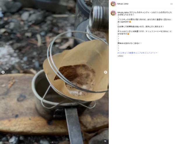 もちろん専用ケトルほどの使い勝手には及ばないが、ドリップコーヒーを淹れることも可能。荷物を減らしたいときや、手持ちの装備でやりくりしたい場面で活躍してくれる。
