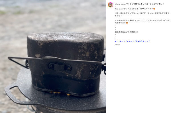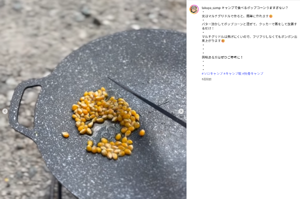 タクヤさんは「キャンプで食べるポップコーンうますぎない?」「実はマルチグリドルで作ると、簡単に作れます」とコメントして、作り方を紹介。