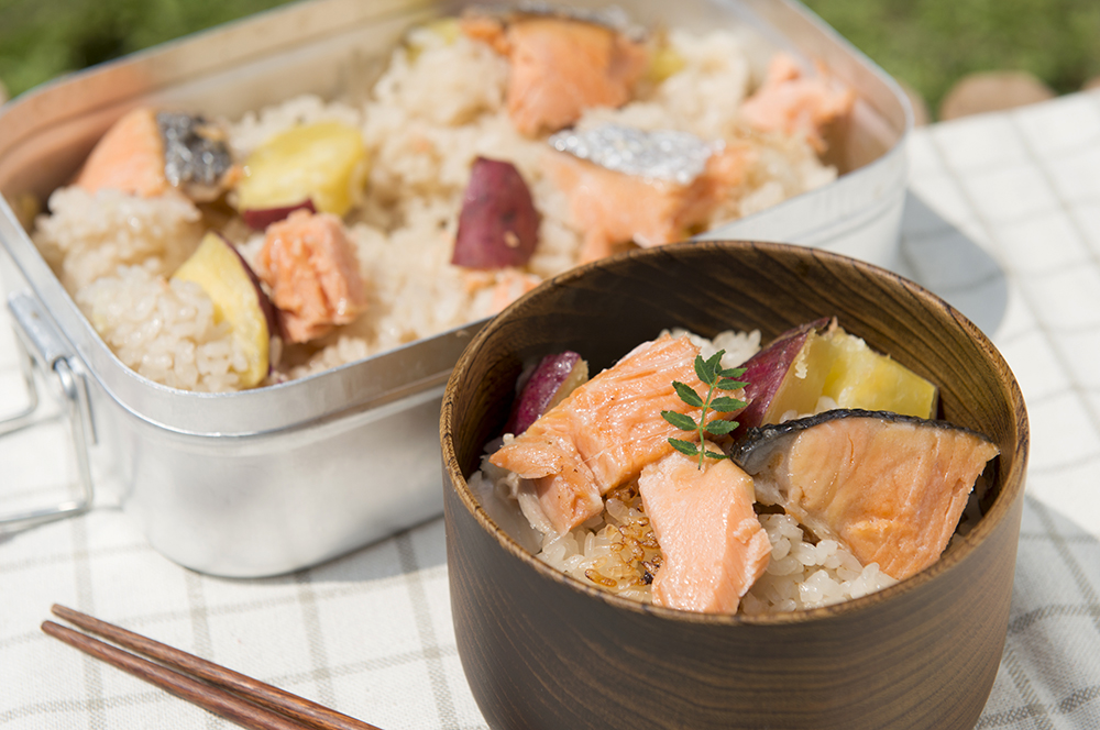 新米と秋の味覚を使ったレシピを、とオーダーしたうちの一品。サツマイモと新米の甘み、秋鮭の塩気がこんなに合うなんて思わなかった! ゴロゴロ感もあって食べ応えあり。作り方も簡単で、メスティンに食材を入れて炊飯するだけ。この手軽さにも惹かれました。