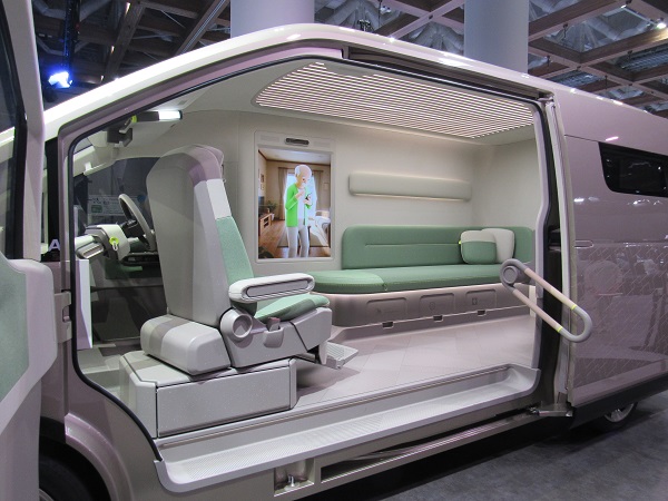 Bピラーはなく、運転席と助手席は回転式。助手席はリフト機能もある。後部座席には長いベンチ。介護現場や、移動診療所といったイメージだろうか。内部には大型モニターも設置されていた。