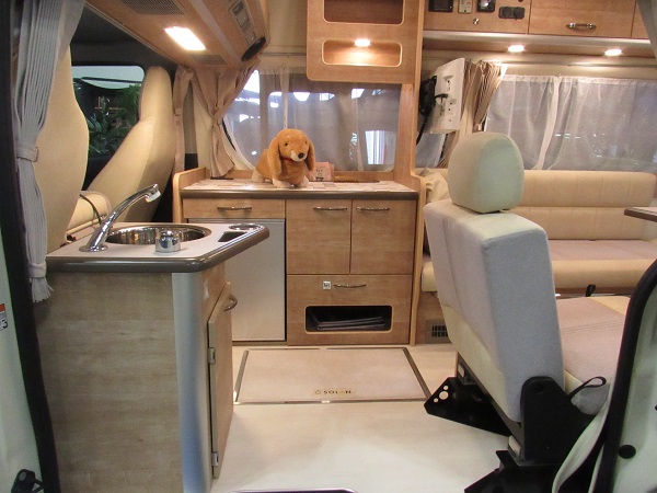 ソランのキャンピングカー内装部分を紹介していこう。まず目に入ってくるのが、シンクとその他が分割されたキッチン。分割されていることで、前席から直接移動することが可能になる。