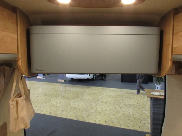 最後部にはスリムなルームエアコンが設置される。安心と信頼のダイキン製。暑さ・寒さを言葉で伝えられないペットとの旅で、エアコンは必須である。