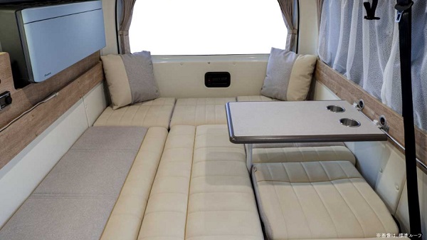 ベッド展開時は3人が横並びで就寝できる。写真は標準ルーフ仕様車のためエアコンが横にあり、テーブルは格納できる。こちらも引っ掻きに強く防汚・防水生地のREVOシートだ。