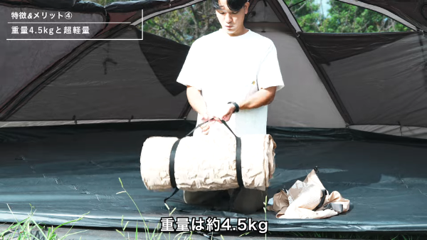 サイズは2人就寝を想定した210×132cm。生地はポリエステル+TPU、芯材はウレタンフォーム。カラーはベージュ系で、重量は約4.5kg。ダブルのインフレーターマットが6〜7kg台になることも多いことを踏まえると、持ち運びの負担は軽い部類に入る。