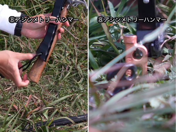最後に紹介する「アシンメトリーハンマー」は、その名の通り左右非対称の爪を備えたペグハンマーだ。細いピンペグから太い鍛造ペグまで、素材や形状を問わずつかみやすいよう、爪の形状を変えているのが特徴である。