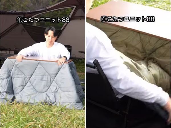「こたつユニット88」は、アルミテーブルの上に掛け布団と付属の天板を重ねるだけで、簡単にこたつ化できるユニットである。サイズは天板が86×39cm、掛け布団が220×175cmと、ファミリーやグループで囲むのにちょうどいいバランスだ。
