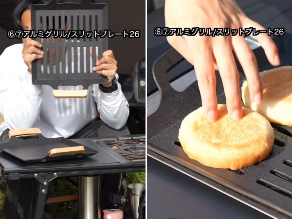 底面の突起でグリルやバーナーに固定できる点はグリルプレート26と同様だが、こちらはシリコン樹脂加工に加えて穴あき仕様となっているため、余分な油を下に落としつつ、直火の香ばしさをしっかり付けられる。肉やソーセージはもちろん、餅やパン、焼きおにぎりなど“カリッと感”を出したい食材と相性が良い。