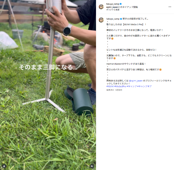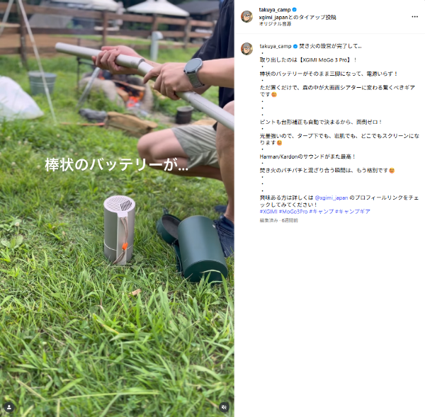 焚き火の設営がひと段落して、夜の森が少しずつ暗くなってくるころタクヤさんがバックパックから取り出したのは、XGIMIの「MoGo 3 Pro」だ。