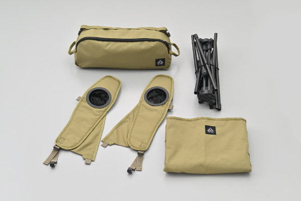 さらにオートバイのシートバッグ(46cm幅)に収まる製品設計であり、使用後はコンパクトに収納できる。収納袋にはパルステープとカラビナを標準装備し、チェアの足元に固定することで小物入れとしても活用可能である。