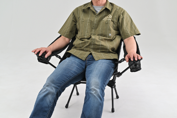 さらに肘掛けの角度はベルトで調整でき、焚き火を眺めるリラックス姿勢から、食事時の前傾姿勢まで、シーンに合わせて微調整が可能である。