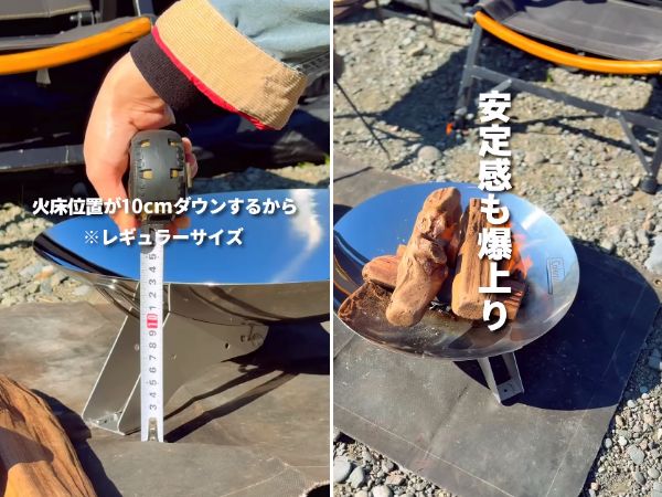 火床の高さが約13cmになり、熱が足元に届きやすくなる。冷え込みが厳しい冬の夜は、焚き火のそばにいる時間そのものが快適になると感じられる。