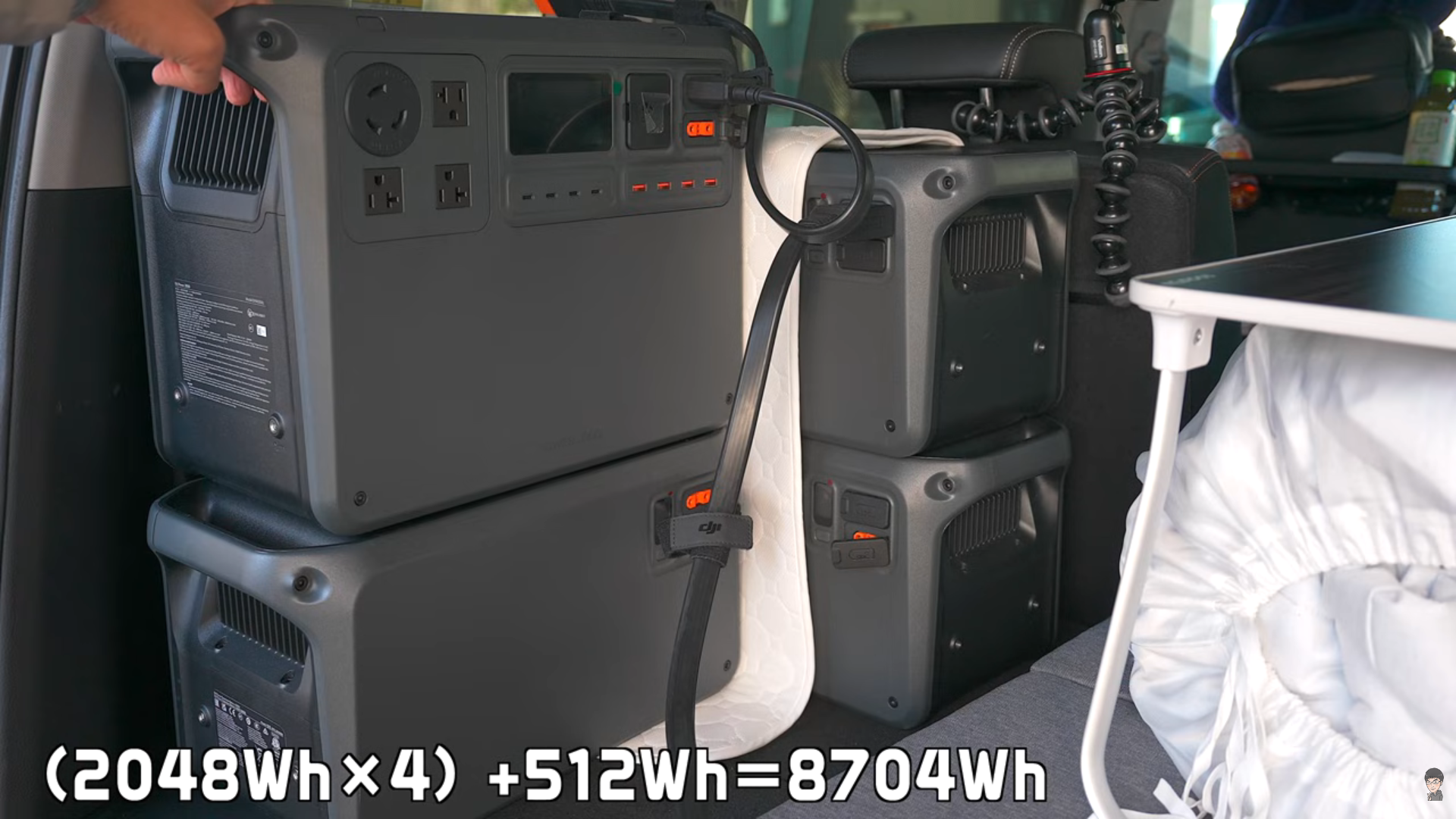 出発前、荷室には“本気の冬装備”。DJIの大容量ポータブル電源群を縦積みし、Power 2000+拡張バッテリー3台で「合計だいたい8000Wh」に予備の500Whを追加。「ちょっとしたプラグインハイブリッドぐらいの電気」と語った。公式の金属固定具とバンドでしっかり固縛し、「これで上からガタンと落ちたりってことはない」と積載安全も確保した。