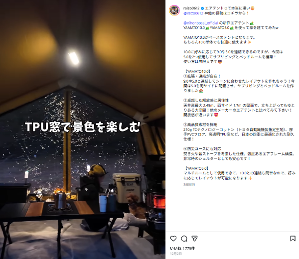 「アウトドア大好き!仲良しアラフォー夫婦」としてSNSを中心にキャンプ情報を発信している、MASAさんがInstagramを更新。今、注目のエアテントを紹介した。