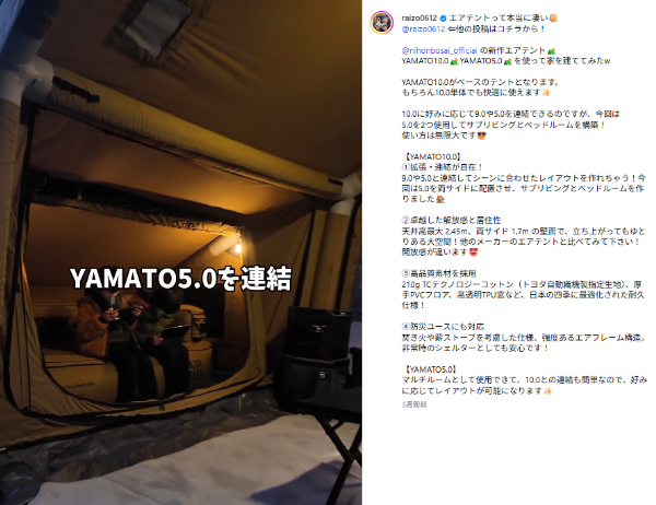 MASAさんは、日本防災の新作エアテント「YAMATO 10.0/5.0」を紹介。ベースに「YAMATO 10.0」を据え、両側に「YAMATO 5.0」を連結することで、まるで家のような拡張性を強調している。