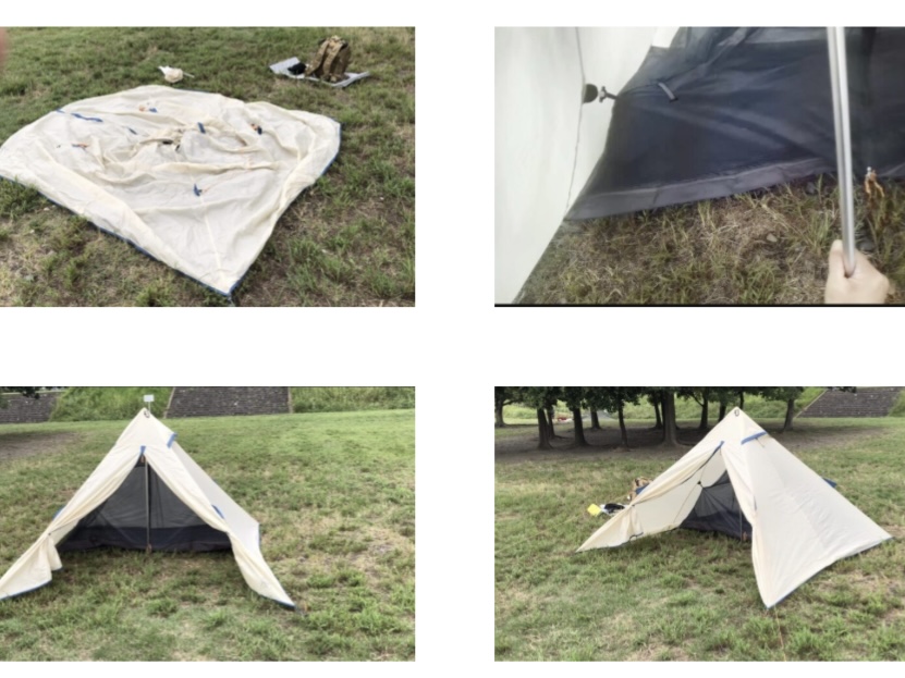 ①4隅を固定→②ポールで立ち上げ→③ロープの固定→④フルペグダウンで設営完了。